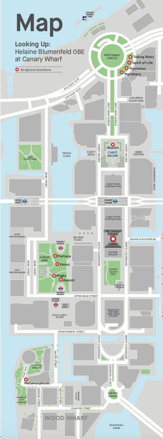 “People going into a museum are open to revelation and reflection. Exhibiting in One Canada Square and in the surrounding parks is a greater challenge,” says Helaine Blumenfeld OBE. “My concern has been to create sculpture that provides reference points for the people who experience them and connects the physical space they find themselves in to the spiritual space they might enter. Beauty is one of the most important reasons Public Art exists. Public Art is a way of introducing the possibility of participating in Beauty to a wide audience.”